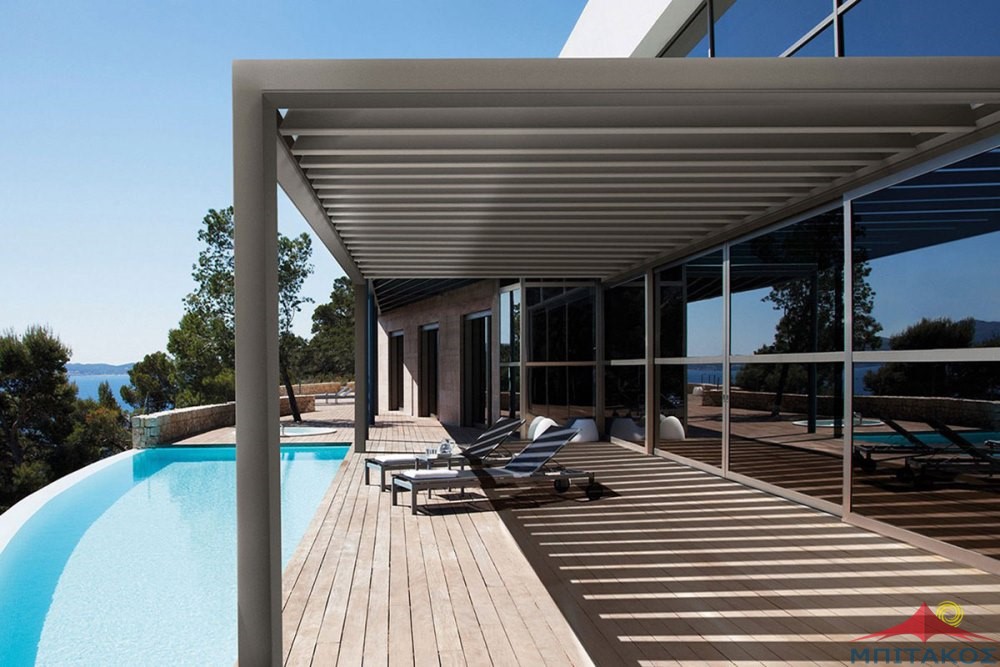 Το νέο σύστημα Pergola είναι ένα πρωτοποριακό στεγανό σύστημα σκίασης εξ’ολοκλήρου από αλουμίνιο με περιστρεφόμενες περσίδες, το οποίο παρέχει προστασία από την ηλιακή ακτινοβολία σε συνθήκες ηλιοφάνειας, αλλά και από τη βροχή ή το χιόνι με σύστημα ελεγχόμενης απορροής υδάτων.